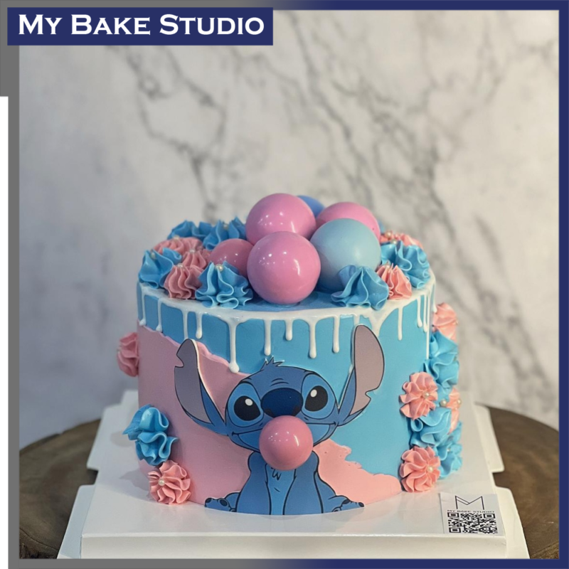 Stitch Cake. Frosted with Swiss Meringue Butter Cream. Decorated with Toy Balloon and edible image.