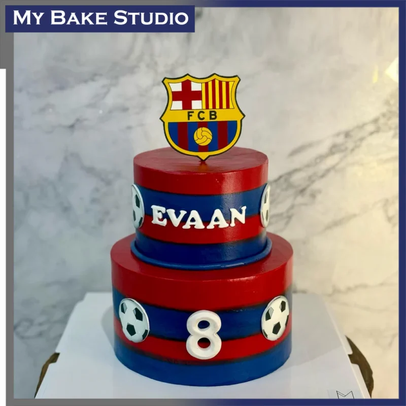Custom FC Barcelona celebration cake by My Bake Studio! Personalize names, colors & tiers. Perfect for birthdays, wins & true Culers. Order now!